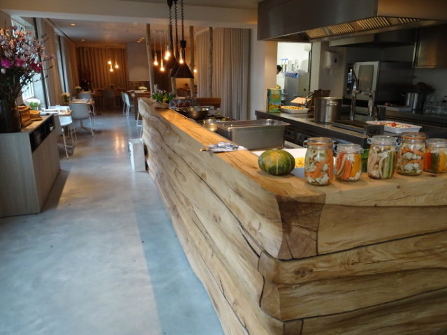 Al toen we binnenkwamen viel ons meteen de warmte van de ruimte op. Het interieur sprak ons direct aan. Het lijkt zelfs een beetje op de stijl die wij op onze kantoren hebben: ruwe en natuurlijke materialen, organisch en met veel hout. Dit overgoten met een modern tintje. Warm en gezellig! Ze hebben een prachtige eiken bar, een echte blikvanger.