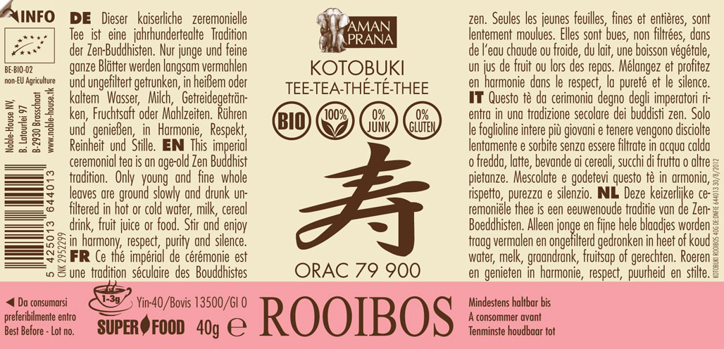 Amanprana Rooibos provient de 200 agriculteurs africains de Clanwilliam dans la région de Cederberg, à 200 km du Cap. Ce Rooibos est sélectionné par des experts en fonction de son parfum, de sa longueur, de sa couleur, de son goût et de sa valeur pour la santé.