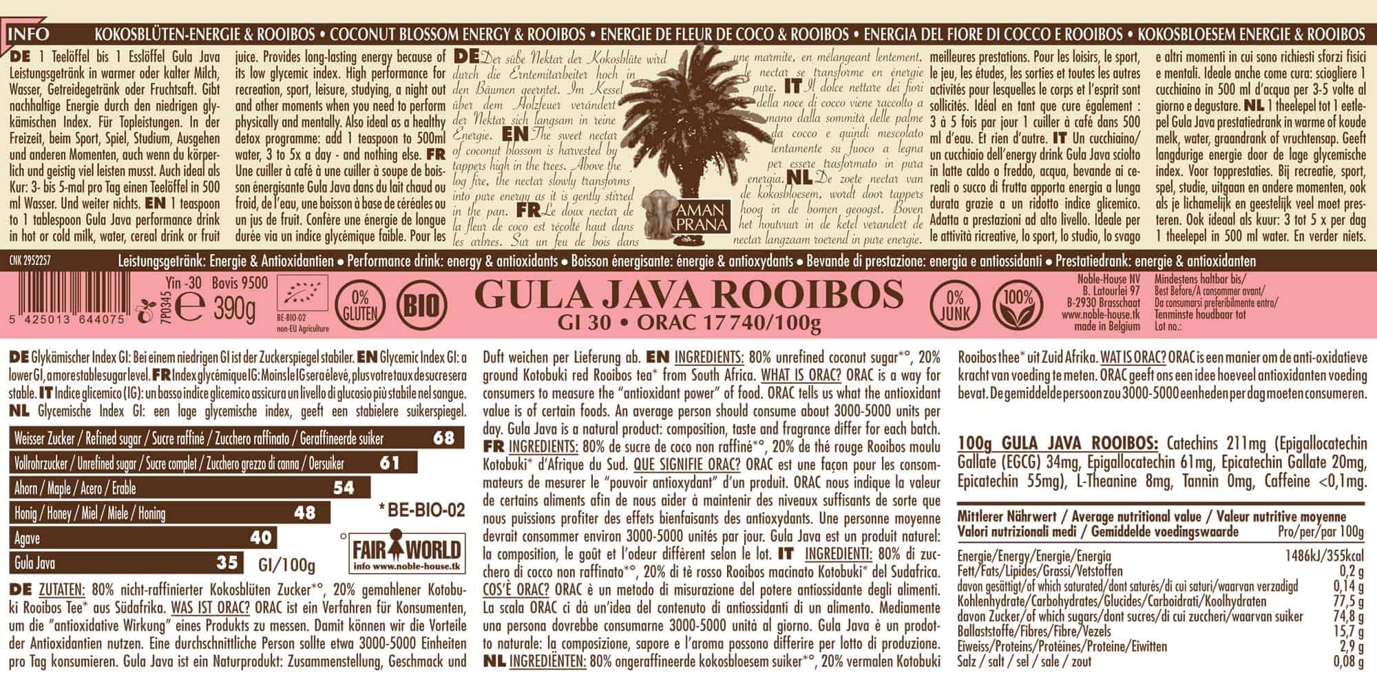 40% sucre de fleur de coco*, 30% écorce de coco (fine)*, 20% réglisse*, 10% rooibos*